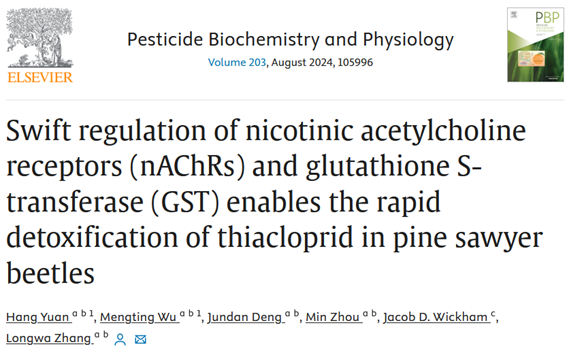 张龙娃教授课题组在《Pesticide Biochemistry and Physiology》(IF=4.7,中科院一区)发表在重大林业害虫松墨天牛对噻虫嗪解毒机制方面的最新研究论文,题目为“Swift regulation of nicotinic acetylcholine receptors (nAChRs) and glutathione S-transferase (GST) enables the rapid detoxification of thiacloprid in pine sawyer beetles”。