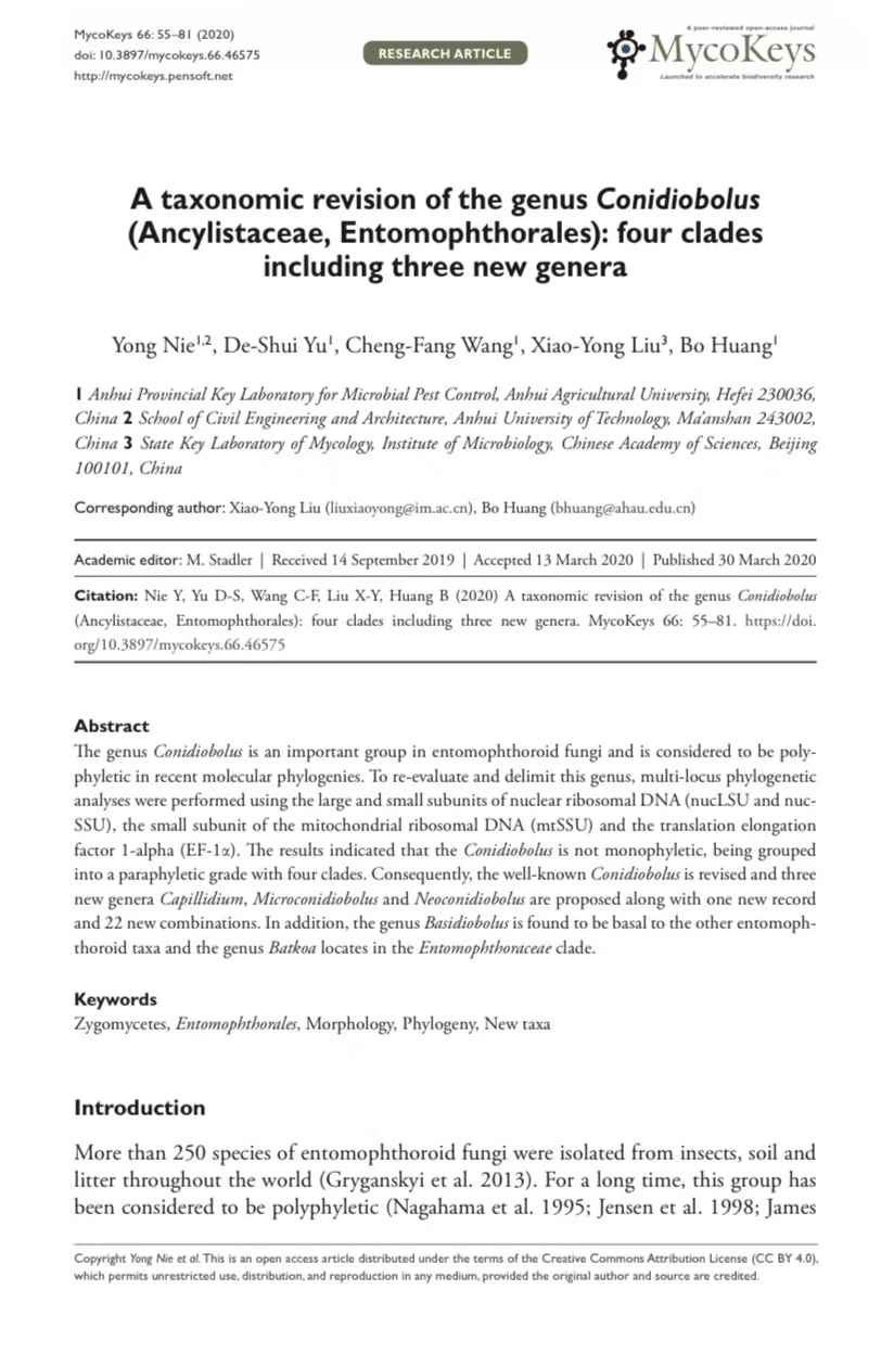 五一假期刚刚过去,重点实验室就传出了好消息。由实验室主任黄勃教授主导的耳霉真菌分类与系统发育学研究取得重大科研进展。经过黄勃教授课题组的十多年的长期深入研究,最终对耳霉属真菌进行了系统修订,命名了3个新属,论文正式发表在真菌分类学SCI期刊MYCOKEYS上。本成果的发表,解决了耳霉分类与系统发育中的一些重要科学问题,具有十分重要的科学价值。